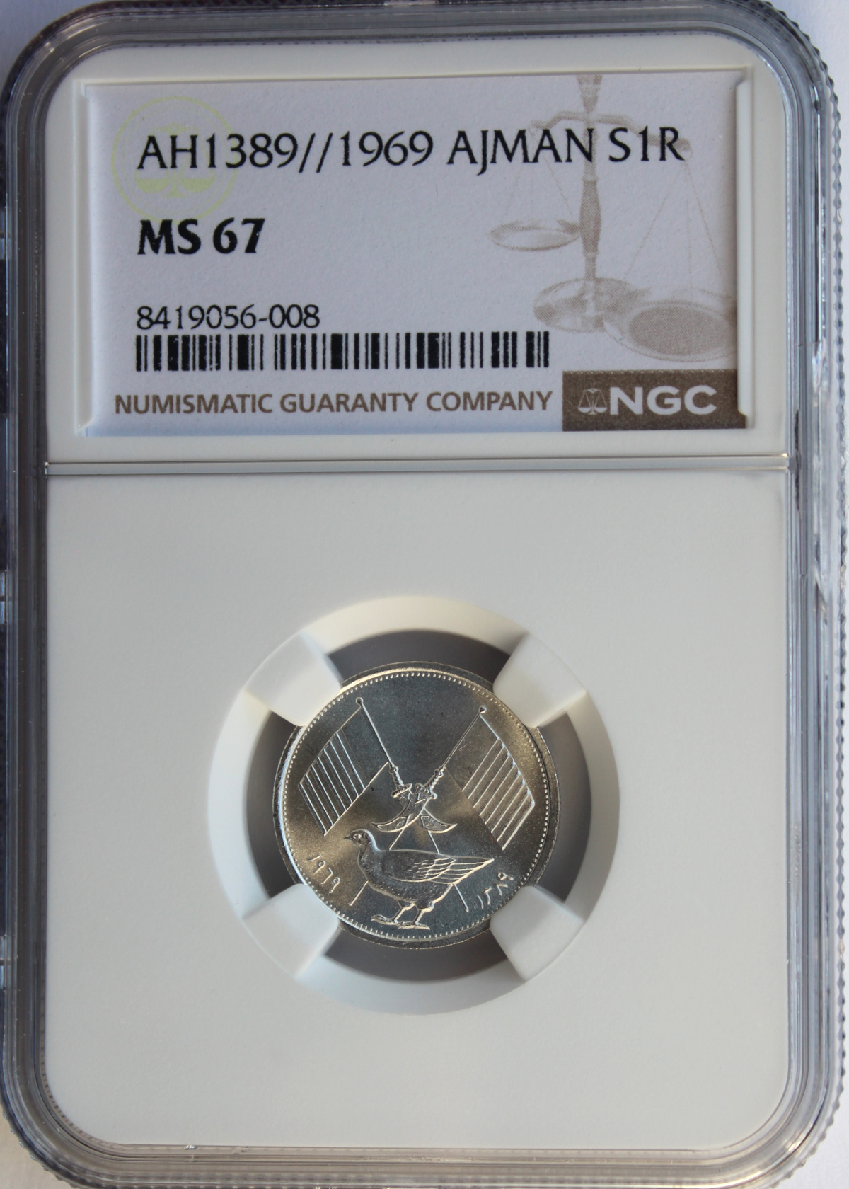 UNITED ARAB EMIRATES, AJMAN AH1389 - 1969 SILVER 1 RIYAL. NGC MS-67. KM-1.1.