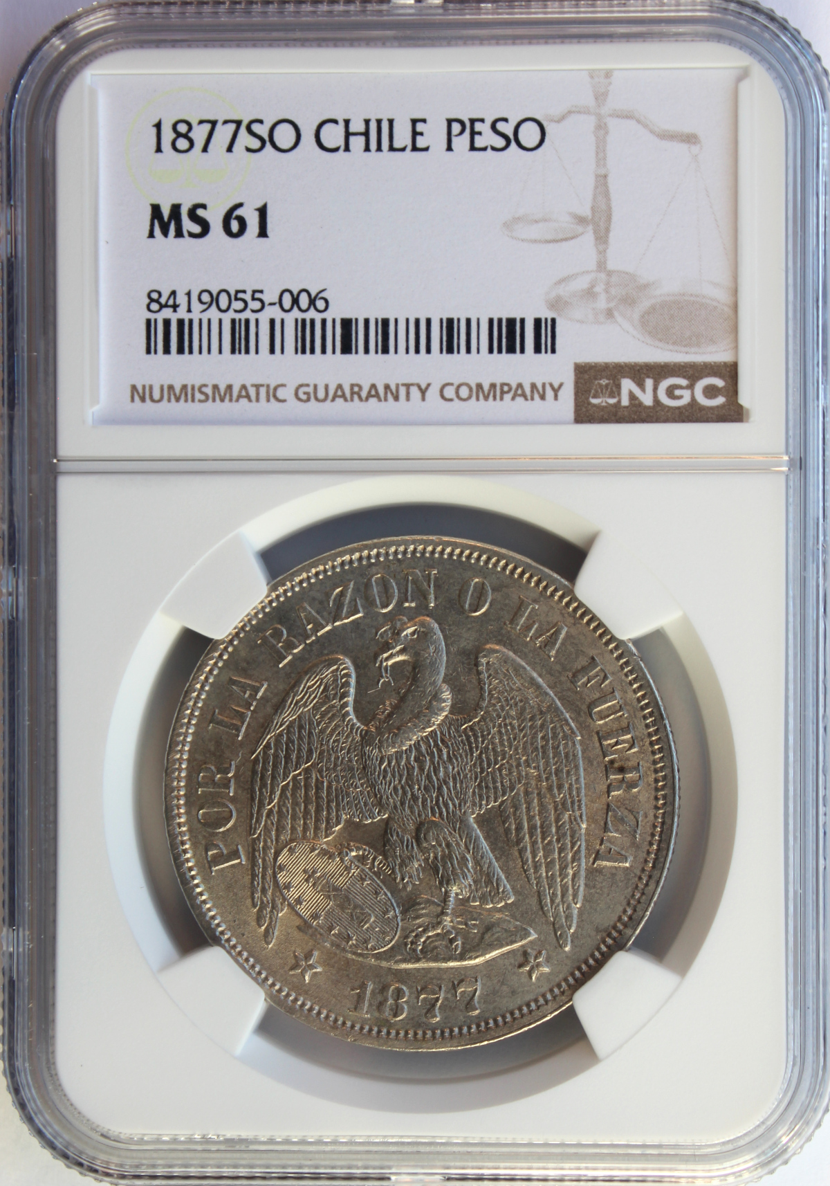 CHILE 1877-So SILVER UN PESO. NGC MS-61. NATURALLY TONED UNCIRCULATED COIN.