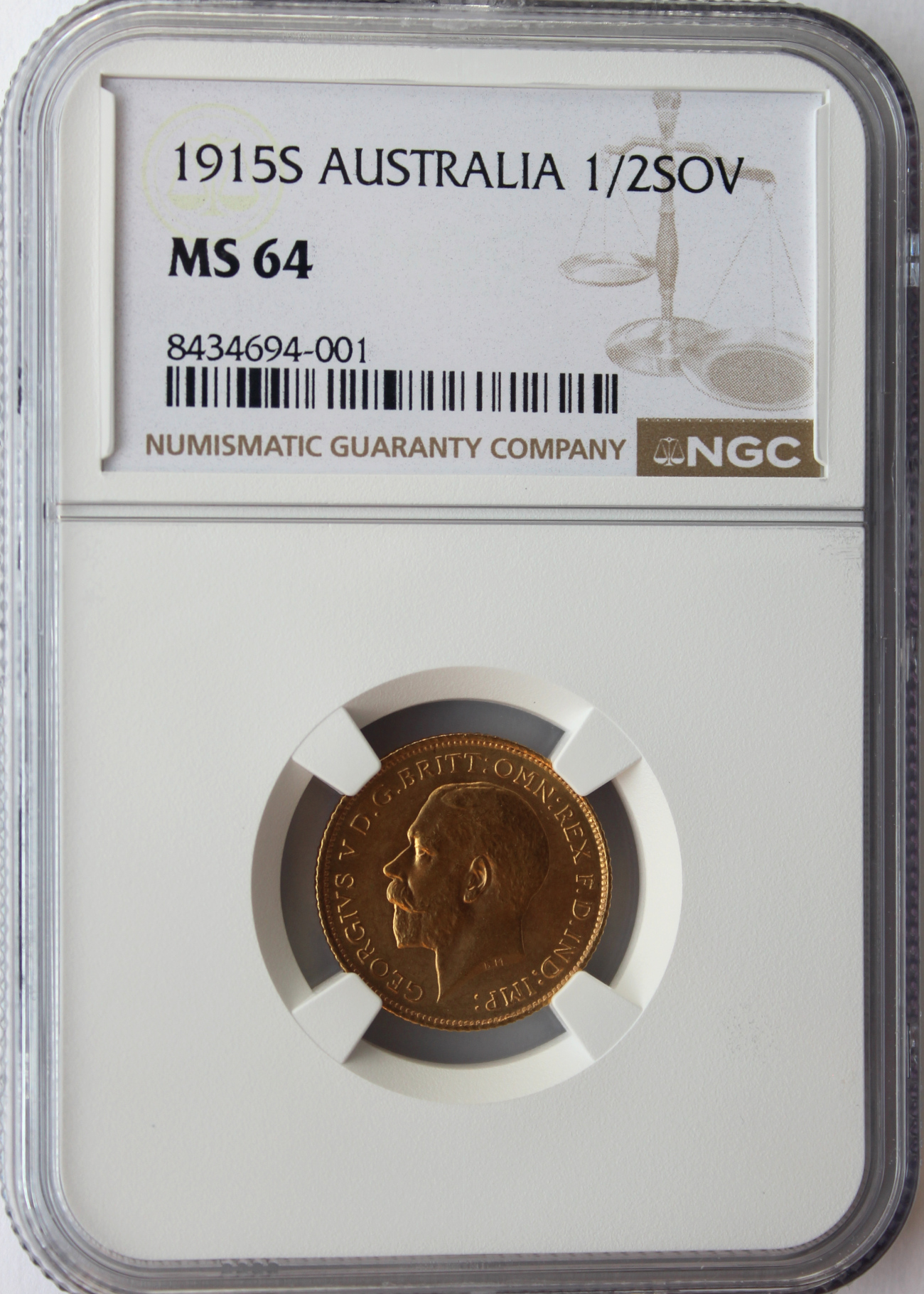 Australia 1915-S Gold half Sovereign. Graded by NGC as Choice Uncirculated MS-64. 3.99 grams of 0.917 Gold, 0.1178 oz. AGW, 19 mm.