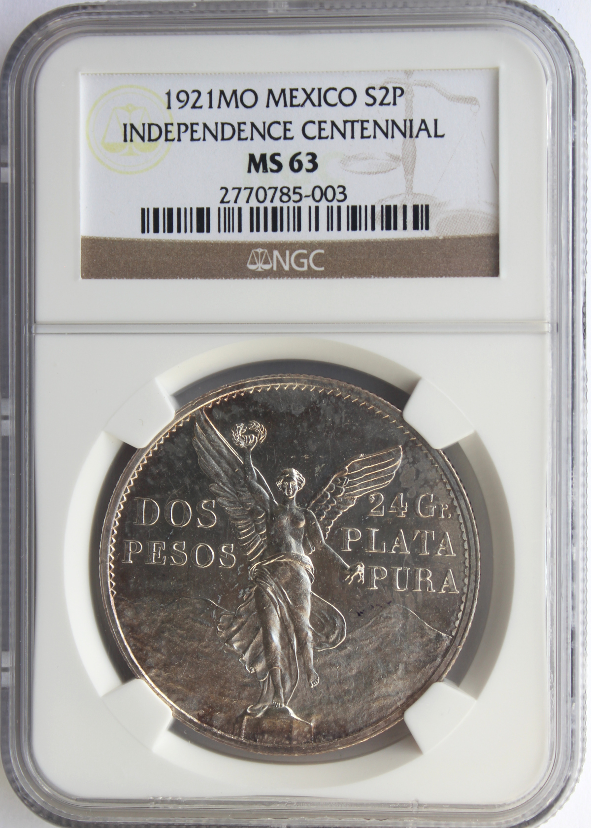 MEXICO 1921-Mo SILVER 2 PESOS. INDEPENDENCE CENTENNIAL. KM-462. NGC MS-63.